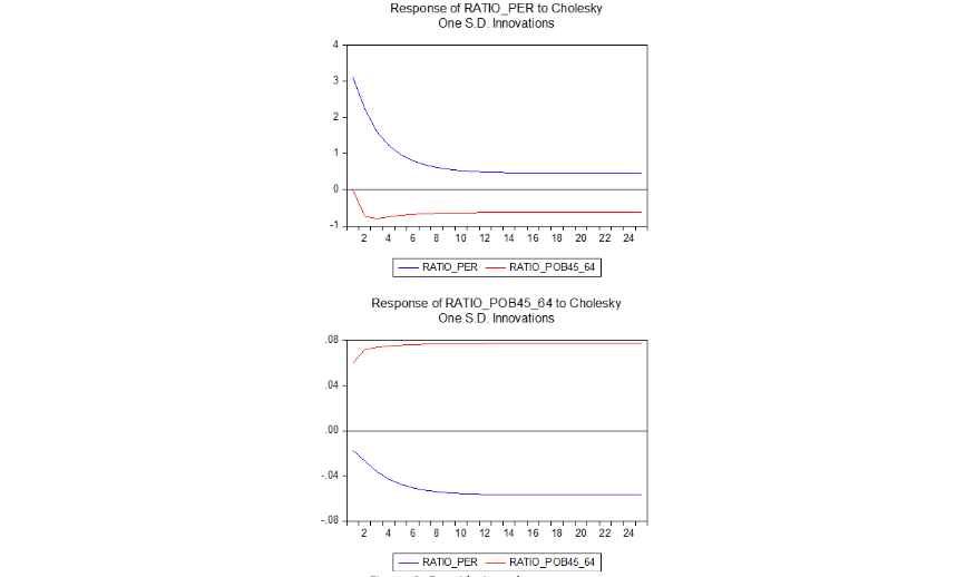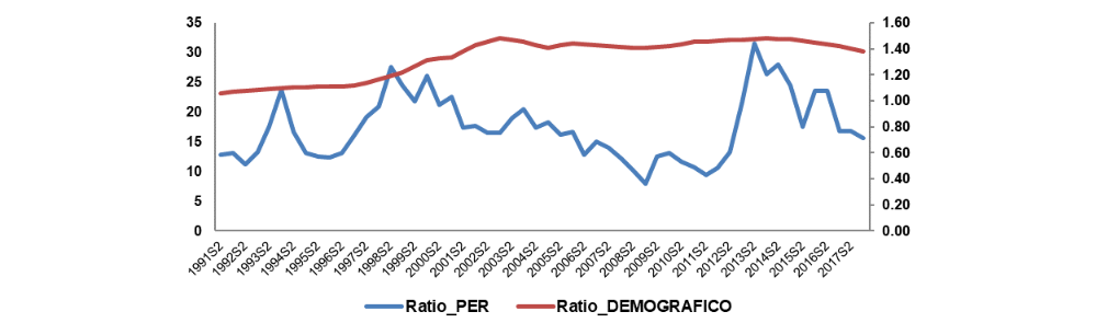La estimación realizada proporciona evidencia empírica de la asociación entre ambas variables. El indicador demográfico compara las dos cohortes más significativas en el análisis planteado excluyendo a los muy jóvenes por la escasa relevancia de sus carteras de acciones y a los que ya llevan tiempo en la jubilación. Un incremento de esta ratio se asocia con un aumento de la valoración de las acciones. La relación a estimar se modeliza utilizando un MCE. El análisis realizado revela que la relación existente entre RATIO_PER y RATIO_DEMOGRAFICO es permanente, de largo plazo e inversamente proporcional.