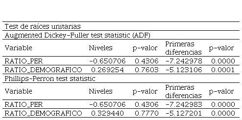 Fuente: elaboración propiaFormalmente, se contrasta la hipótesis de estacionariedad siguiendo las pautas tradicionales de los estudios con series temporales. Mediante el test de Dickey-Fuller Aumentadas (ADF) y Phillips-Perron, respectivamente, se contrasta como hipótesis nula la existencia de raíces unitarias, comprobando si no es rechazada en niveles si lo es en primeras diferencias. Ambas series, RATIO_PER y RATIO_DEMOGRAFICO son integradas de orden uno, Tabla 2, y cointegradas ( Tabla 3). Mediante el test de Johansen, según la prueba de la traza y del máximo valor propio para un nivel de significatividad del uno por ciento, se detecta la existencia de una relación de cointegración. Teniendo en cuenta que, de acuerdo con el teorema de representación de Granger, los sistemas que incorporan en su especificación variables cointegradas son normalmente formulados como Modelos de Corrección de Error (MCE).