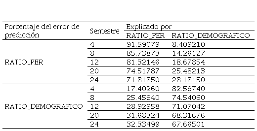 Fuente: elaboración propiaLa vinculación entre ambos ciclos se refrenda igualmente en el análisis de la descomposición de la varianza, recogido en la Tabla 5, que profundiza los resultados al visualizar el peso de cada variable en la determinación de la desviación típica del error de predicción. El error de predicción de RATIO_PER después de dos años (4 semestres) del shock viene explicado principalmente por sí mismo, 91,59 por ciento, el RATIO_DEMOGRAFICO representa el 8,41 por ciento. Cuatro años (8 semestres) después del shock su peso disminuye hasta el 85,74 por ciento y el peso del RATIO_DEMOGRAFICO aumenta 5,85 puntos porcentuales (14,26 por ciento). Pasados diez (20 semestres) y doce (24 semestres) años del shock el aumento del peso del factor demográfico es claramente significativo, 18,67 y 25,48 por ciento, respectivamente. En el mismo periodo se observa también la relación inversa, esto es, el peso que en el error de predicción del factor demográfico desempeña el factor financiero. La asociación inversamente proporcional se aprecia en la correlación existente entre ambas series (-0,2517).