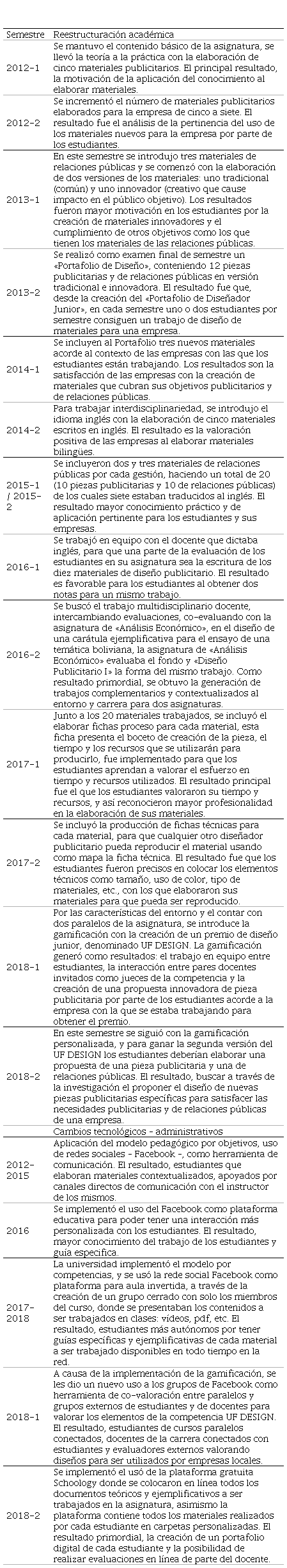 Los resultados del análisis de los cambios realizados en el proceso enseñanza y aprendizaje, ejecutados durante los 14 semestres (2012-2018) en que se dictó la asignatura «Diseño Publicitario I» de la carrera de Publicidad y Marketing, son presentados bajo la dirección teórica de Blázquez Andújar, et al (2007) y Morín (2001), verificando la teoría en la práctica a través de la autoevaluación docente.