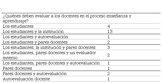 Fuente: elaboración propiaDe los resultados del Tabla 2, se puede concluir que 13 de los docentes (43 %) señalan que los encargados de evaluar a los docentes deberían ser la institución y los estudiantes; 4 de los docentes (13 %) señalan que solo estudiantes deben evaluarlos; y un docente (0,03 %) afirmó que la autoevaluación debe realizarla el mismo docente.