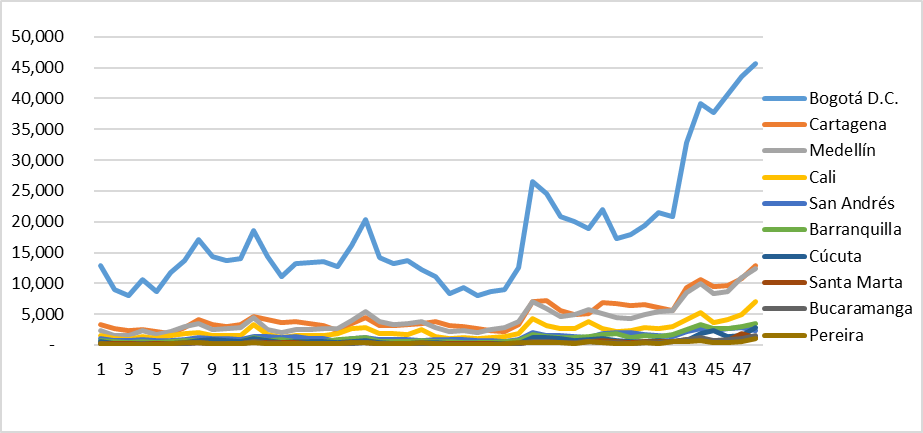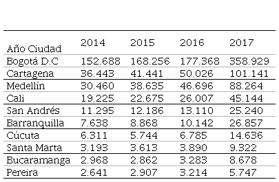 En la Figura 2, se muestran los hallazgos encontrados en el análisis estadístico, que se realizaron a través de la información de los boletines de Migración Colombia, en un intervalo entre enero de 2014 y diciembre de 2017, respectivamente, para un total de 48 datos mensuales, agrupados anualmente. Teniendo en cuenta las 10 principales ciudades receptoras de venezolanos, en el respectivo orden, se tiene: Bogotá, Cartagena, Medellín, Cali, San Andrés, Barranquilla, Cúcuta, Santa Marta, Bucaramanga, Pereira.