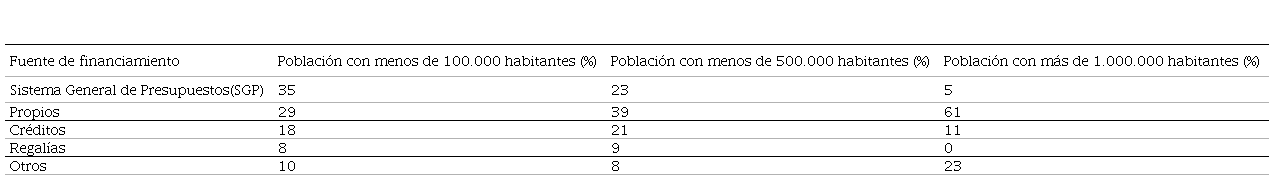Otro aspecto que contribuye al estudio, dice el DNP, es la disminución de la población y el envejecimiento de la población urbana, lo cual implica cambios en el mercado de trabajo. El 70 % de la fuerza de trabajo calificado en Colombia se concentra en Bogotá, Medellín y Cali. El PIB per cápita en las aglomeraciones urbanas de más de 1.000.000 de personas creció entre el 2002 al 2010 un 3,08 %, en tanto aquellas entre 500.000 a 1.000.000 de habitantes creció un 2,97 %. En casi la totalidad de ciudades se tienen cubierto en un gran porcentaje las necesidades de servicios públicos (agua, saneamiento, energía), pero persiste en forma estructural un déficit de vivienda y se incrementa la urbanización informal o asentamientos subnormales. Los ingresos tributarios para las ciudades en aglomeraciones urbanas crecieron a un ritmo del 4 % y la inversión a un 1,3 % entre de 2000 a 2010. La Tabla 1 denota que las fuentes de financiamiento que tienen los municipios en Colombia dependerá del número de población en cada territorio.