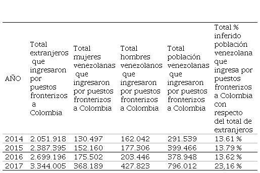 En la tabla 2, se obtuvo información de los extranjeros que entraron a Colombia en un rango de 2014 a 2017, a su vez con inferencia estadística se precisan los venezolanos (hombre- mujeres) que ingresaron al país por puestos fronterizos.
