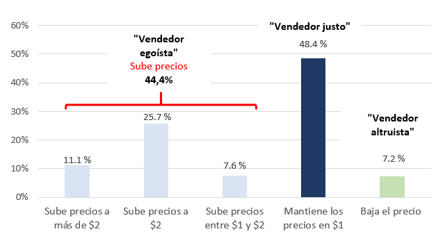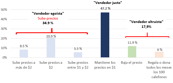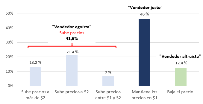 Fuente: elaboración propia a partir de datos en EconomáticaSegún las respuestas brindadas por los encuestados se formaron los siguientes tipos de vendedores: egoístas, altruistas o justos, según decidieran subir, bajar o donar; o bien, como una tercera posibilidad, mantener el precio. Es decir, tal como se adelantó en el último párrafo de la Introducción, estas son las definiciones: el vendedor es egoísta si sube el precio. El vendedor es altruista si baja el precio. El vendedor es justo si mantiene el precio o no lo mueve en absoluto, lo cual no significa que su precio sea el justo. La cuestión no es el precio como valor y/o cantidad sino el comportamiento.