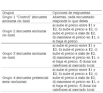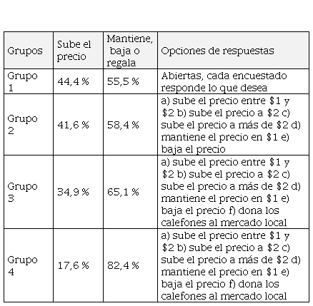 En el Grupo 2 (ver Figura 2), con el mismo tamaño muestra, se le dio opciones cerradas de respuestas: a) sube el precio entre $1 y $2; b) sube el precio a $2; c) sube el precio a más de $2; d) mantiene el precio en $1; o e) baja el precio. En el Grupo 3 (ver Figura 3) se repitió la opción del Grupo 2 sobre otras 500 personas, pero se agregó la opción ?donaría los calefones en el mercado local?. Una característica de estos tres grupos fue que la encuesta se realizó de manera on-line, y de forma anónima. Así, el encuestado se sentía en la libertad de responder sin la mirada de otro que lo juzgue en sus elecciones. En el Grupo 4 (ver Figura 4), sin embargo, se presentaron las mismas opciones que en el Grupo 3, pero la encuesta se realizó en forma presencial y sobre 250 casos (Ver Tabla 1).