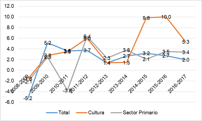 En la Figura 1, se muestra el crecimiento anual de la cultura en comparación del total de la economía. Se verifica que, en muchas ocasiones, el crecimiento del valor de las actividades, bienes y servicios culturales se encuentra muy por arriba del crecimiento del PIB, pero también implica una tasa anual por encima del sector primario, el cual cabe mencionar, tiene una tasa de crecimiento anual del 1.96 %, durante este periodo.