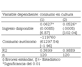 donde CC es el gasto privado en cultura, ?0 es el consumo autónomo y ?1 es la propensión al consumo en cultura.