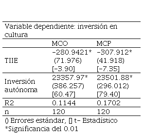 Fuente: elaboración propia a partir del Sistema de Cuentas Satelitales de la Cultura (INEGI) INEGI (2018b). () Errores estándar,[] t- Estadístico* Significancia del 0.01Table 2. Calculation of investment in culture