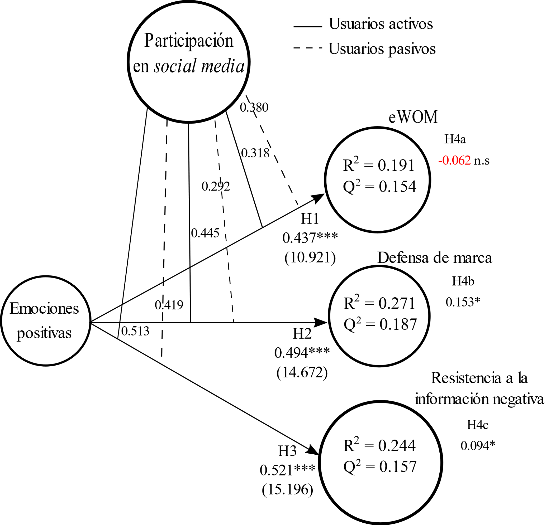 Las trayectorias anteriores evidencian una mayor fuerza en la moderación del grupo de los usuarios activos en comparación con los usuarios pasivos, por lo que se aceptan las hipótesis H4b y H4c. Sin embargo, se advierte que es más intensa la moderación sobre la relación que existe entre las emociones positivas y DM.