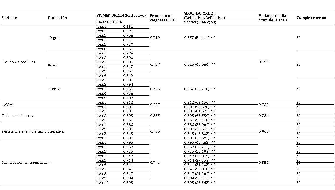 En el presente trabajo las emociones positivas (alegría, amor y orgullo) fueron concebidas como un constructo multidimensional de segundo orden reflectivo-reflectivo que actúa como variable independiente. Los constructos dependientes (eWom, DM y RIN) y el constructo moderador (participación en social media) fueron concebidos como constructos unidimensionales reflectivos. El procesamiento se realizó utilizando una técnica multivariante de análisis de datos conocida como modelización de ecuaciones estructurales del tipo mínimos cuadrados parciales (PLS-SEM).