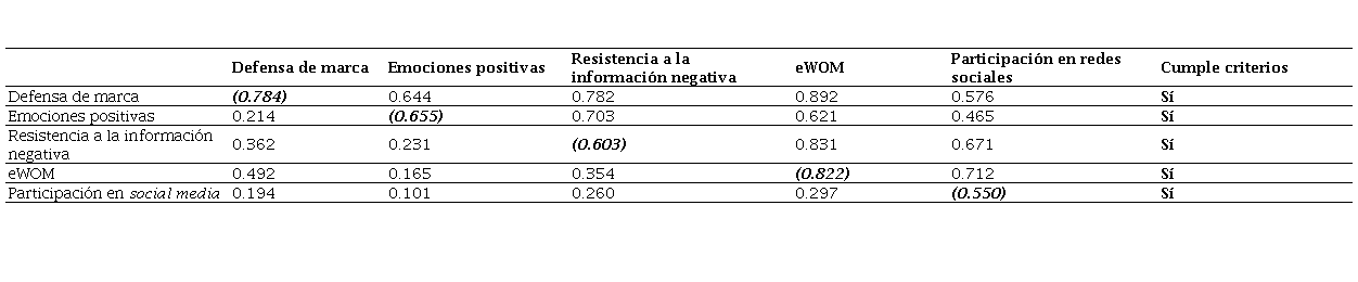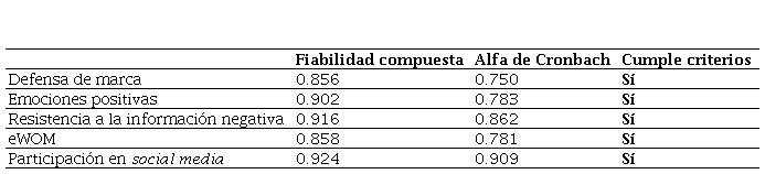 Finalmente, en la Tabla 3 se presenta la consistencia interna que se analizó a partir del índice de fiabilidad compuesta y el alfa de Cronbach cuyos valores deben superar el umbral de 0.7.