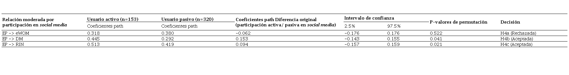 En el desarrollo de esta investigación se planteó el efecto moderador de la participación del consumidor en el social media sobre cada una de las tres hipótesis anteriores. Previo al análisis multigrupo para verificar la moderación, se comprobó la invarianza de la configuración y la invarianza de los compuestos, garantizando que la correlación original de cada compuesto fuera mayor o igual que el cuantil del 5% (con p value de permutación >0.05). Los resultados del análisis, a partir de las permutaciones entre las dos submuestras, pueden observarse en la Tabla 4. El primer grupo lo conforman los usuarios pasivos con un total de 320 individuos que alcanzan un promedio para el puntaje de sus respuestas de participación en social media de 3.3/7, lo que los ubica por debajo de la muestra general (que alcanzó una media de 4.5/7); el segundo grupo lo integran 153 individuos que contribuyen activamente en la creación de contenido en el social media con un promedio de puntaje en sus respuestas de 5.9/7.