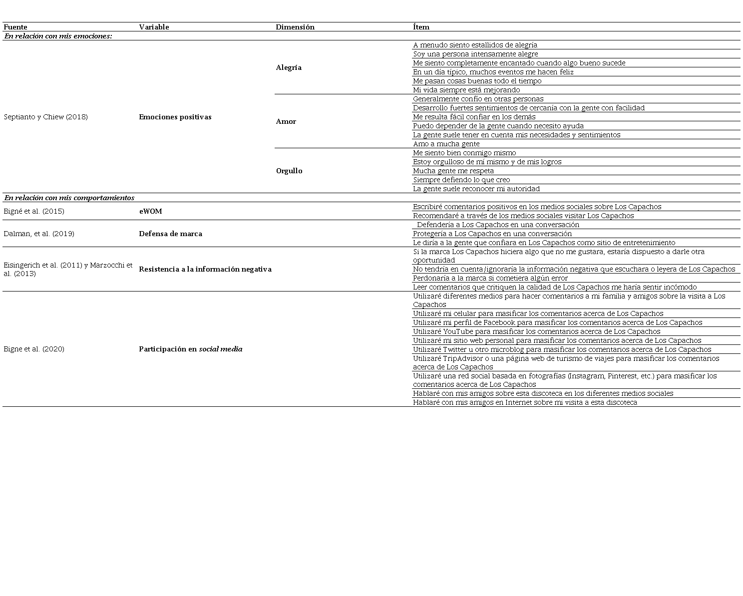 Por lo anterior, la divulgación y el intercambio de información mediante el uso del social media promueve algunos comportamientos tendientes a la autopresentación del usuario, por esta razón crea y comparte imágenes, videos, emojis, emoticonos y comentarios que expresan la emoción que experimentan como consumidores de la marca Los Capachos. En consecuencia, este estudio concluye que las emociones positivas tienen una relación significativa con eWOM, DM y RIN. Sin embargo, se advierte que no todos los usuarios de la marca tienen la misma propensión a participar activamente en la contribución y consumo de contenido online.