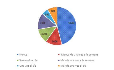 En la Figura 1 se presenta la frecuencia de uso de aplicaciones móviles para la gestión de negocios lecheros. El 26 % de los empresarios ganaderos encuestados utilizaban aplicaciones móviles para la gestión de sus negocios con frecuencia igual o mayor a una vez a la semana.
