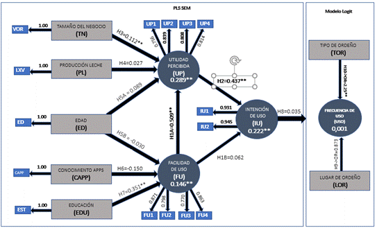 Se utilizó una modelación de ecuaciones estructurales por el enfoque de mínimos cuadrados parciales (PLS-SEM). El tamaño de la muestra y las diferencias contextuales entre la zona de estudio y otros contextos donde se han realizado estudios similares, justificaron el uso de esta técnica (Hair et al., 2017). La intención de uso (ITU), facilidad de uso (FU), la utilidad percibida (PU) y la frecuencia de uso (FRU) fueron clasificados como constructos reflectivos (Freeze y Raschke, 2007), es decir que los indicadores son causados por el constructo. El tamaño del negocio, la producción de leche, la edad del empresario, el conocimiento sobre aplicaciones móviles y el nivel de educación fueron variables exógenas de un solo ítem dentro del modelo clasificadas como reflectivas (Michels et al., 2019).