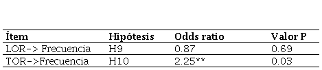 Nota: H= Hipótesis. **=Hipótesis soportada. OR= Odds ratio. VOR= Vacas en ordeño. LXV= Litros/vaca/día. ED= Edad. CAPP= Conocimiento previo sobre aplicaciones móviles. EST= Estudio posterior al bachillerato.