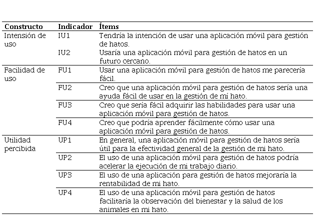 Se recolectó información de 122 empresarios ganaderos en Colombia, utilizando formularios de Google enviados vía correo electrónico durante el periodo comprendido entre los meses de mayo y septiembre de 2020. El instrumento se estructuró de la siguiente manera: en la sección inicial se preguntó sobre las características socioeconómicas de los empresarios y de sus unidades productivas, así como el uso o tenencia de tecnologías como teléfonos inteligentes, internet, aplicaciones móviles o software de computador para la gestión de negocios lecheros. En segundo lugar, se indagó sobre 10 ítems ajustados del TAM validado por Michels et al. (2019) (ver Tabla 1), adaptados a su vez de los trabajos de Davis (1989) y Venkatesh y Davis (2000). Se utilizó una escala Likert de 5 puntos para evaluar el grado de acuerdo o desacuerdo de los empresarios con estos ítems. La tercera sección abordó la frecuencia de uso de aplicaciones móviles para la gestión de negocios lecheros (las frecuencias evaluadas fueron 1= nunca, 2= menos de una vez a la semana, 3 semanalmente, 4= Más de una vez a la semana, 5= una vez al día, 6= más de una vez al día). En la cuarta y última sección se indagó por la utilidad que tenían para los empresarios ganaderos las posibles funciones incluidas en una aplicación móvil para la gestión de negocios lecheros. Las funciones evaluadas estuvieron relacionadas con gestión de la reproducción, salud animal, gestión de información, control del ordeño y gestión de la alimentación (Michels et al., 2019).