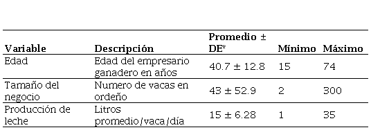 Las características de las unidades productivas y los empresarios ganaderos encuestados se presentan en la Tabla 2. El tamaño promedio de los negocios obtenido en este estudio corresponde a tamaños medianos según la clasificación propuesta por Barrios y Olivera (2013).
