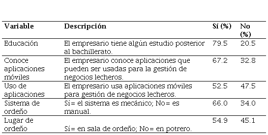 Un alto porcentaje de los empresarios ganaderos encuestados tenía estudios posteriores al bachillerato (ver Tabla 3). La mayoría conocía aplicaciones móviles para la gestión de negocios lecheros, pero solo la mitad usaba estas aplicaciones rutinariamente.