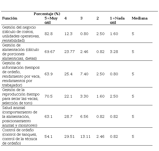 Fuente: elaboración propia.Todas las funciones evaluadas tuvieron una alta calificación. Se destaca la gestión del negocio como la función con mayor utilidad percibida. El control de ordeño fue la función con menor calificación (ver Tabla 4).