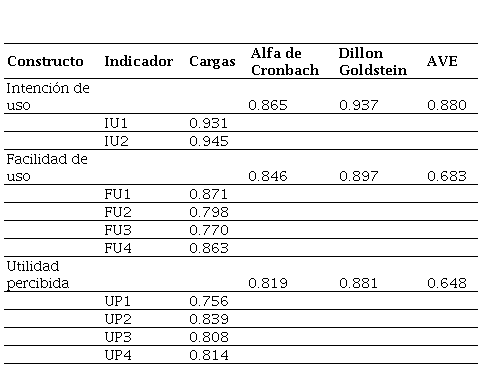 Fuente: elaboración propia.Alfa de Cronbach > 0.7; Dillon – Goldstein >0.7; AVE > 0.5.