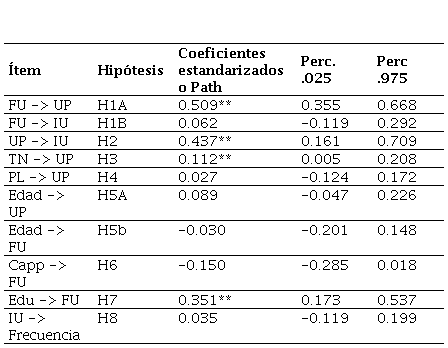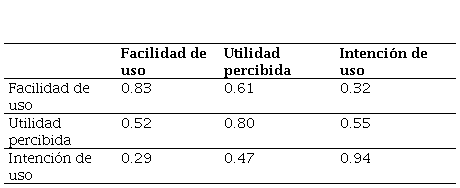 En la Tabla 7 se representan los R. del modelo (Chin, 1998). El modelo desarrollado en este estudio tuvo una explicación moderada para la intención de uso y la utilidad percibida, mientras que para la facilidad de uso tuvo una explicación débil. Todos los constructos presentaron Q. > 0, lo que indicó que el modelo tuvo buena relevancia predictiva.