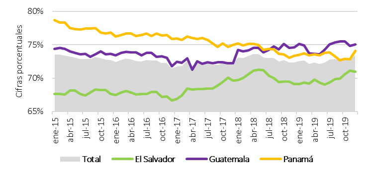 En lo individual, el sistema bancario salvadoreño fue el que presentó el comportamiento más bajo a lo largo de todo el periodo estudiado con un promedio de 68.80 %. Esto se puede explicar dada la baja participación de los depósitos como fuente de financiación, pues su participación promedio fue del 78.20 % mientras que la contribución de los pasivos osciló de manera estable sobre el 88 %. De esta manera, se evidenció un desincentivo por el uso de los depósitos bancarios al reportarse una disminución del 1.11 % entre enero de 2015 a enero de 2017 por un posible aumento sobre sus costos, prefiriendo así adquirir otro tipo de obligaciones financieras para respaldar su crecimiento en el nivel de activos. Ahora bien, aunque de enero de 2017 en adelante se reportó un leve repunte, su participación al cierre de 2019 no alcanzó a superar el 79 % sobre el total de los pasivos.