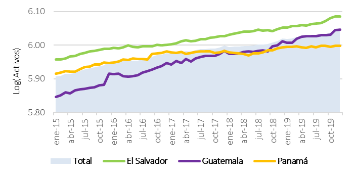 La Figura 2 describe la tendencia del tamaño bancario. Con respecto a los agregados, se evidencia un comportamiento creciente y similar para los tres países de acuerdo con lo esperado en la literatura teórica y empírica. Adicionalmente, se evidencia que El Salvador es el país que cuenta con las instituciones de mayor tamaño, ya que durante todo el periodo analizado conservaron las cifras más altas con respecto a los otros dos países y al promedio total. Esto es explicado teniendo en cuenta que, al ser el país con la menor cantidad de bancos, es el sistema que conserva las concentraciones más altas por institución. Los bancos en Guatemala reflejan el mejor crecimiento, pues pasaron de ser las instituciones más pequeñas, a ubicarse sobre el promedio total al finalizar el periodo. Por último, Panamá evidenció un incremento desacelerado en los activos bancarios que los sitúa con el indicador más pequeño y por debajo del promedio a cierre de 2019, debido a que reportó las menores tasas de crecimiento mensual.