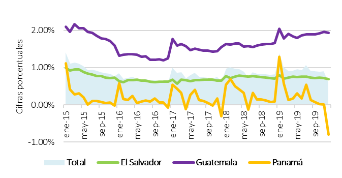 Asimismo, en promedio se obtuvo un retorno mensual agrupado sobre el total de los activos de 0.61 % y se percibió un riesgo de portafolio del 2.26 %. Esto significa que, por cada 100 dólares puestos en créditos comerciales, cada institución bancaria en promedio provisiona US$2.26 ante un posible escenario de impago y recibe US$0.61 de retorno mensual. Cabe mencionar que, en el aspecto individual, la banca de Guatemala reportó en promedio la mejor rentabilidad respecto a los demás países, pero que a su vez registró los mayores niveles de provisión dado el alto riesgo percibido sobre la cartera de crédito.