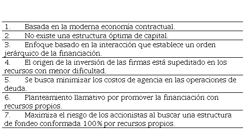 Esta propuesta teórica fue presentada por Myers (1984) y estuvo en contravía a lo planteado por la teoría del trade-off al argumentar que las firmas no están constituidas alrededor de un equilibrio en la deuda. En su planteamiento, Myers afirmó que la firma no tenía una razón óptima de endeudamiento producto de la compensación entre sus costos y beneficios, sino que en las decisiones de financiamiento lo fundamental era disminuir los costos generados por problemas de asimetría de información.