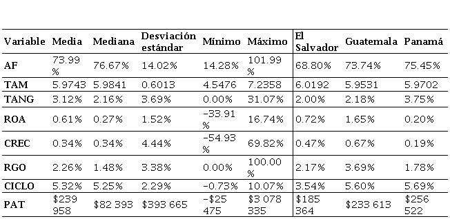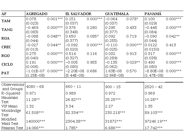 Para el caso de la rentabilidad de las firmas ROA, se evidencia una relación inversa con respecto al nivel de AF y un p-valor por debajo de la significancia estadística del 5 % para la estimación agregada y la de la banca panameña. Con este resultado se permite inferir que entre mayor sea la rentabilidad percibida por el negocio, las firmas preferirían hacer mayor uso de sus recursos propios dado el menor costo por asimetría de información asociado sobre cualquier otro recurso (incluida la deuda). En cuanto a CREC, se observa un coeficiente significativo, tanto en el ejercicio agrupado, como en el cálculo para la banca en El Salvador y Guatemala. Finalmente, RGO presenta una relación positiva y con alta significancia estadística respecto al AF solo para la estimación agregada y la de la banca panameña.