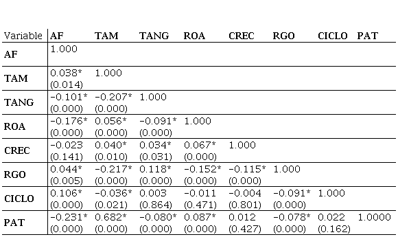 Las posibles relaciones lineales entre apalancamiento financiero y los determinantes transversales de la estructura de capital de las firmas se presentan en el Tabla 5. De allí se destaca que, dentro de los agregados, la mayoría de estas correlaciones dan indicios de un buen ajuste respecto a las predicciones presentadas en la teoría del Pecking Order, pues existe una correspondencia direccional y altamente significativa entre la variable dependiente y los determinantes de capital, a pesar de evidenciarse bajos niveles de asociación lineal individual.