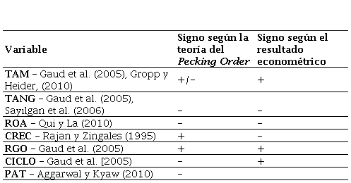 Con respecto a CREC, los resultados obtenidos en el modelo empírico son contrarios al signo esperado según la teoría (Rajan y Zingales, 1995), es decir que las instituciones con mayores niveles de crecimiento en los activos requerirían de un mayor nivel de financiación externa. En este sentido, Antoniou et al. (2008) sugieren que esto puede presentarse cuando existe un incremento en la probabilidad de impago de las obligaciones financieras producto de un elevado nivel de depósitos para un nivel dado de margen operacional. Por tal razón, la teoría del Pecking Orderno sería la más adecuada para explicar dicha relación.