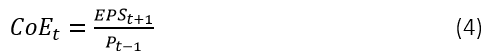 In both models, the expected cost of equity is used as the dependent variable. Such cost of equity has been calculated according to the procedure proposed by Easton (2004), who states that, when increases in abnormal growth in earnings are equal to zero, the rate of return (cost of equity) is equal to the relationship between the earnings forecast for one year and the share price of the previous year ( 4):