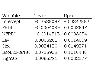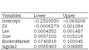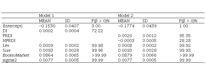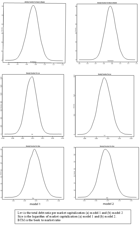 The estimated coefficients based on the Bayesian analysis cannot be interpreted in the same terms as the classical statistical analysis. It is true that the coefficient value of each variable provided by the Bayesian approach (which corresponds to the average value of the posterior probability distribution for that coefficient) coincides with the value of the coefficients obtained by a conventional regression analysis (e.g., ordinary least squares). As a matter of fact, one may interpret the parameters of the ?MEAN? column in Table 2 in the same way as those of the coefficients of a classical regression model. For example, the positive value (0.0009) of the variable Lev in Model 1 ( see Table 2) tells us how much the cost of equity (dependent variable) will increase in case of a unitary change in Lev.