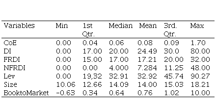 CoE it= ? 0 + ? 1 FRDI it+ ? 2 NFRDI it + ? 3BTM it + ? 4LEV it+ ? 5 SIZE it+ ? it (3)