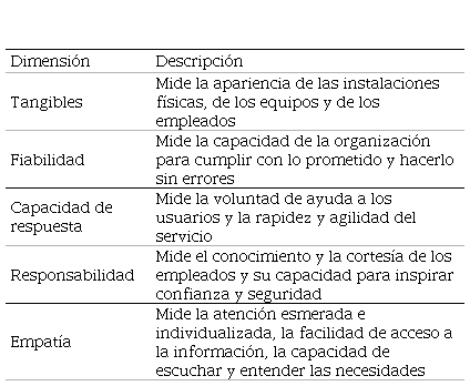 El modelo de la escuela americana de Parasuraman se ha nombrado Servqual y es el más utilizado, dada la proliferación de artículos en el área que usan su escala ( Parasuraman et al., 1985). Estos autores partieron del paradigma de la desconfirmación, al igual que Grönroos, para poder desarrollar un instrumento que permitiera medir la percepción de la calidad en el servicio, para lo cual se plantean las siguientes dimensiones generales: confianza o empatía, fiabilidad, responsabilidad, capacidad de respuesta y tangibles, descritas en la tabla 1.