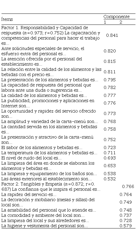 La prueba de adecuación muestral de Kaiser-Meyer-Olkin resultó satisfactoria (KMO = 0.977) y la prueba de esfericidad de Bartlett fue estadísticamente significativa (?2 (300) = 21373.349; p < 0.001). La escala final resultante para evaluar la calidad en el servicio que se percibió incluye dos dimensiones, las cuales explican el 70.999?% de la varianza total. Las escalas resultantes, tras la rotación Varimax con Kaiser, son: Responsabilidad y Capacidad de respuesta (66.424?% de la varianza explicada; 18 ítems) y Tangibles y Empatía (4.576?% de la varianza explicada, siete ítems), las cuales son definidas y mostradas en la tabla 2.