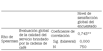 En cuanto a la hipótesis de investigación planteada, se ha confirmado que existe una relación directa y positiva entre las dimensiones que evalúan la calidad en el servicio y el nivel de satisfacción global del consumidor de café. Se encontró evidencia suficiente de que la calidad en el servicio es un antecedente importante de la satisfacción, sobre la que ejerce un nivel de correlación positiva y estadísticamente significativa de 0.743. Estos resultados pueden ser contrastados con los obtenidos por Sanmiguel Jaimes et al., (2015).