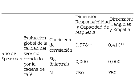 Una vez explicado lo anterior, se prueba la hipótesis planteada en la presente investigación, para la cual se acepta la hipótesis (H1), ya que ambas variables o dimensiones están relacionadas de forma directa y positiva con el nivel de satisfacción global del cliente respecto a la calidad en el servicio otorgada por los establecimientos de la cadena de café.