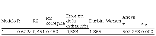 El Anova del modelo, a través del estadístico de Fisher (F=307.288, p=0.000), confirma que el modelo no es producto del azar y se debe generalizar a la población de estudio. Por último, se confirma la relación entre las variables de estudio en un 67.2?%, como lo demuestra la correlación de Pearson, R.