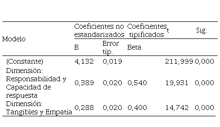 En la tabla 7, se muestran los coeficientes de regresión para cada una de las dimensiones que evalúan la calidad en el servicio y el impacto que estos representan en la explicación de la varianza en la variable dependiente del modelo (nivel de satisfacción global). Se puede observar que, la dimensión que más impacta en la variable dependiente es Responsabilidad y Capacidad de respuesta (?=0.540, t=19.931, p=0.000), seguida por la dimensión de Tangibles y Empatía (?=0.400, t=14.742, p=0.000).