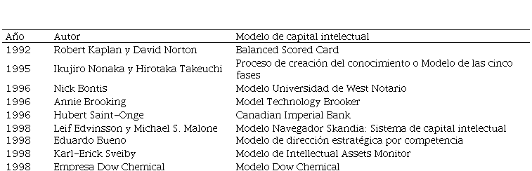 Según los documentos analizados en esta revisión de literatura, en la tabla 2, se sintetizan los modelos de capital intelectual desde el año 1992 hasta 1998, lo que evidencia que estos han sido construidos teniendo en cuenta la evolución y el desarrollo de las organizaciones y las condiciones sociales, económicas, tecnológicas y medioambientales. Gracias a estos elementos, la sociedad ha venido comprendiendo los intangibles como generadores de valor y como una estrategia importante para motivar a las organizaciones a proponer alternativas que otorguen beneficios a la comunidad en general.