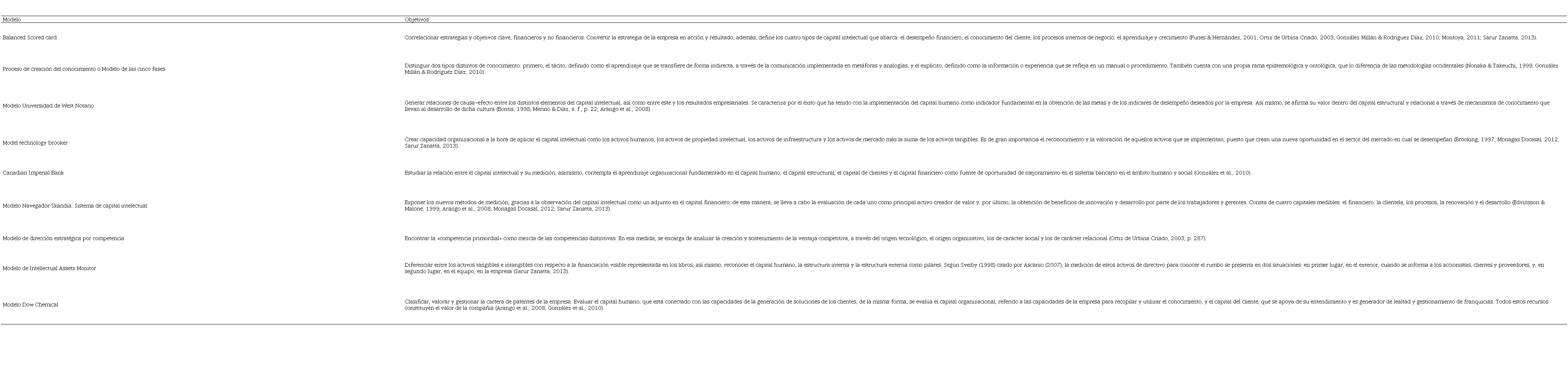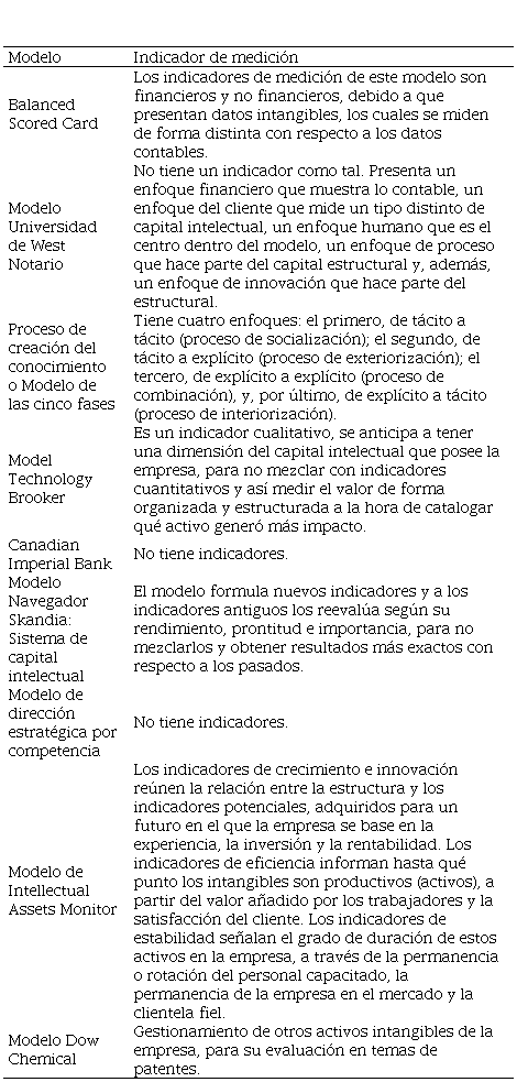 Por último, en la tabla 5 se describen los indicadores que componen cada modelo, de los que se infiere el esfuerzo por definir medidas que permitan capturar los activos intangibles de las empresas, los cuales están estratégicamente identificados como generadores de ventaja competitiva. Sin embargo, la naturaleza intangible de los activos que integran el capital intelectual dificulta su identificación y medición ( Kaplan & Norton, 2004; Naranjo Herrera et al., 2013).