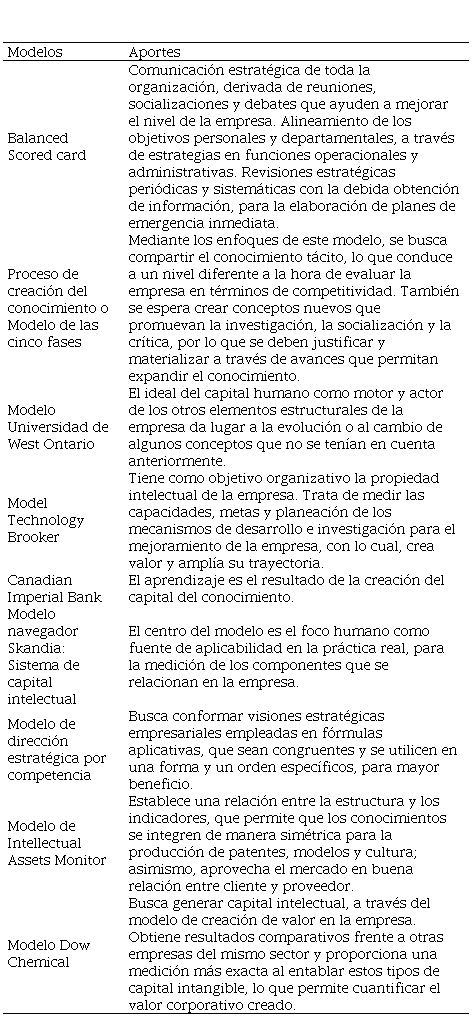 En la tabla 4, se presentan los modelos de capital intelectual con sus respectivos aportes; además, se resaltan los impactos positivos que pueden generar a las empresas como fuentes de creación de valor. Estos modelos evidencian su importancia frente a aspectos como la competitividad y la globalización y la incorporación de acciones como claridad en la estrategia organizacional, la gestión de conocimiento y el proceso administrativo. Así mismo, se estima que la comunicación es un elemento transversal en las áreas, para lograr los objetivos y consolidar el talento humano; a su vez, es un tema primordial, que debe ser articulado a los principios y a la visión de la gestión organizacional.