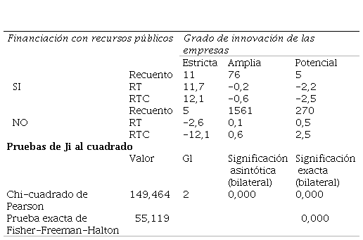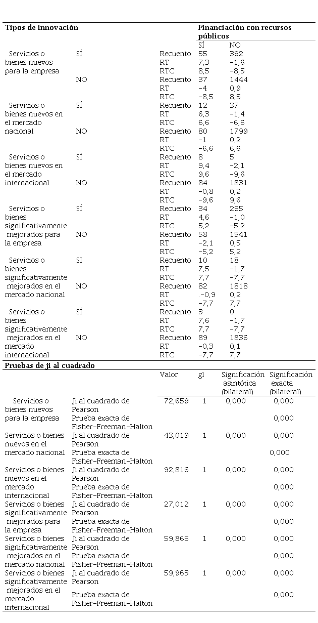 Fuente: elaboración propia. Nota: RT: residuos tipificados, RTC: residuos tipificados corregidos, gl: grados de libertad.Table 10. Types of innovations according to funding with public resources