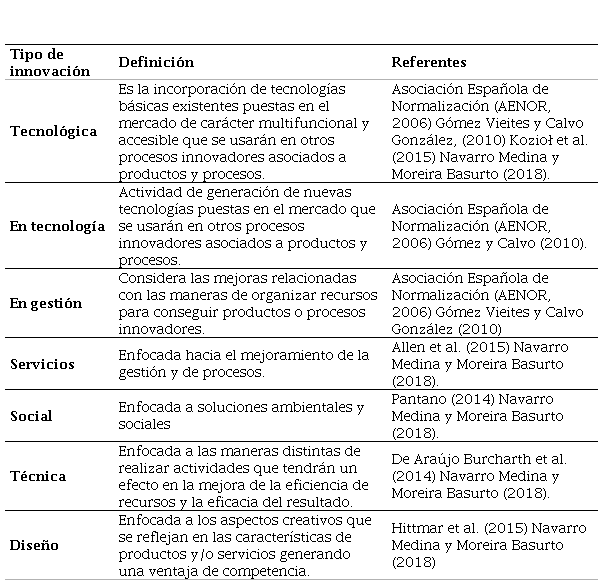En línea con lo anterior, en la Tabla 1 se presentan los tipos de innovación más recurrentes abordados en la literatura, la definición general y algunos referentes.
