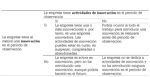 Innovadoras en sentido estricto (EST): empresas que obtuvieron al menos un servicio o bien nuevo o significativamente mejorado en el mercado internacional. Innovadoras en sentido amplio (AMP): empresas que obtuvieron al menos un servicio o bien nuevo o significativamente mejorado en el mercado nacional o para la empresa, o que implementaron un proceso productivo nuevo o significativamente mejorado o una forma organizacional o de comercialización nueva. Potencialmente innovadoras: (POT) empresas que reportan tener un proceso o haber abandonado un proceso de innovación No innovadoras: empresas que en un periodo de análisis no obtuvieron innovaciones, ni reportaron tener en proceso, o haber abandonado algún proyecto de innovación (p.9).