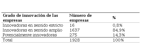 La distribución de la muestra por grado de innovación se presenta en la Tabla 3.